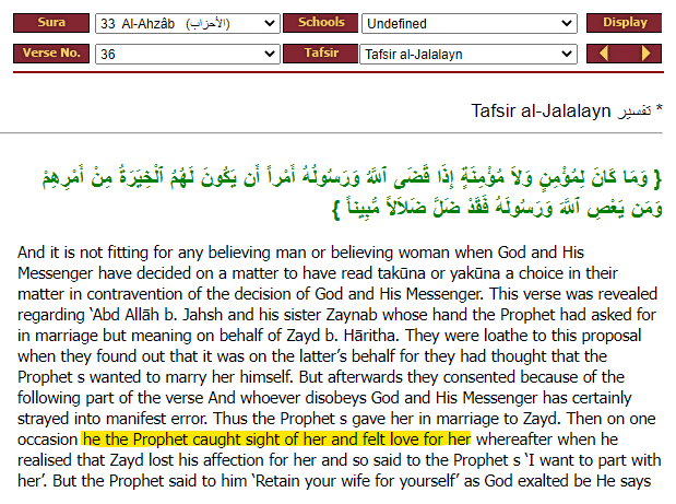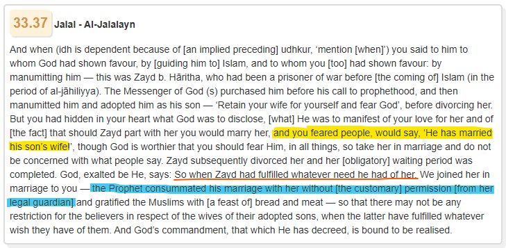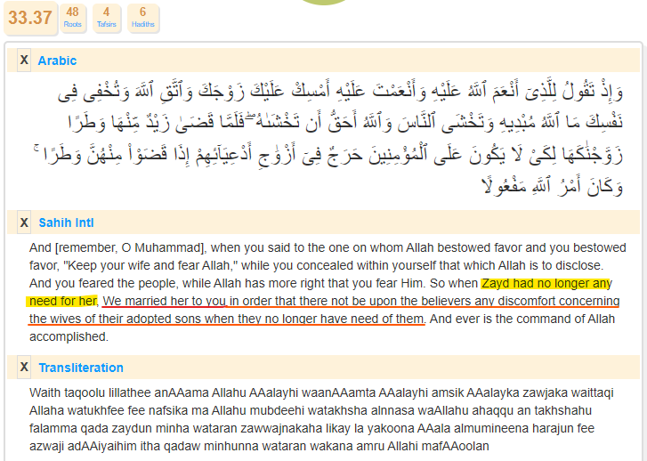 First let's see the ayah regarding the marriage between Muhammad and the wife of his adopted son Zayd. Read Quran 33:37