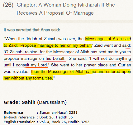 The proposal is made by Zayd itself to Zaynab. Muhammad got no patience and he entered upon her without any formalities before Zaynab consult her Lord.