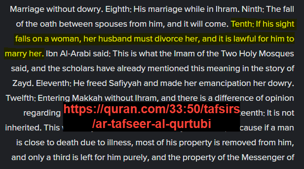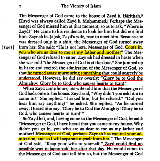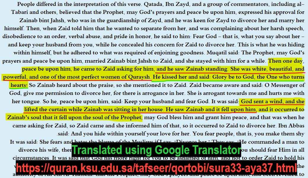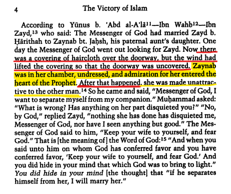 And after this incident happened (seeing Zaynab naked by Muhammad), Zaynab explains this scenario to her husband Zayd; Zayd understood that "...perhaps Zaynab has excited your (Muhammad's) admiration , and so I (Zayd) will separate myself from her."